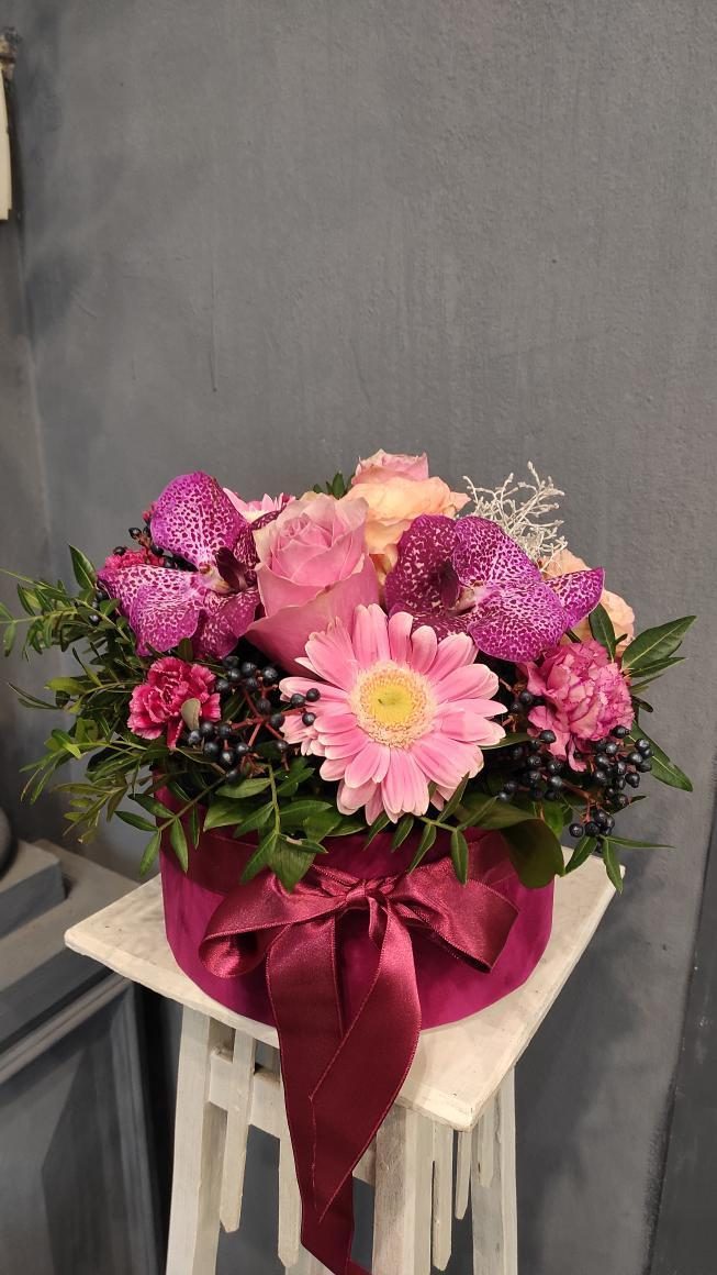 Luksuzni izbor orhideja, ruža, gerbera i raznovrsnog zelenila u plišanoj kutiji