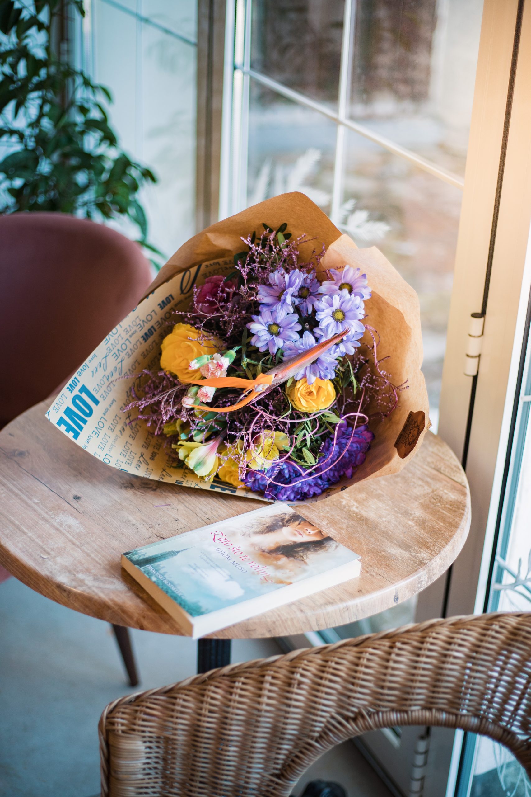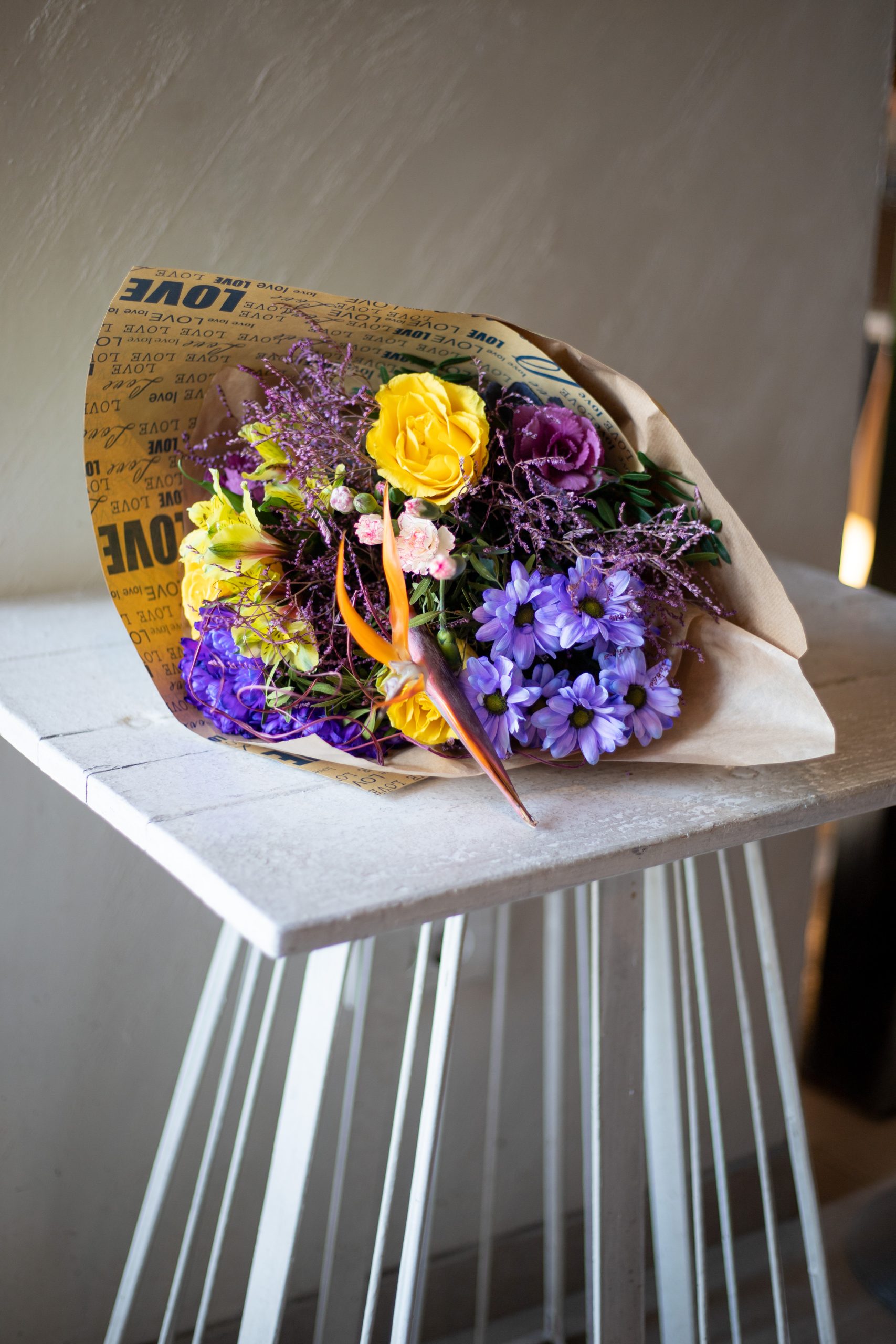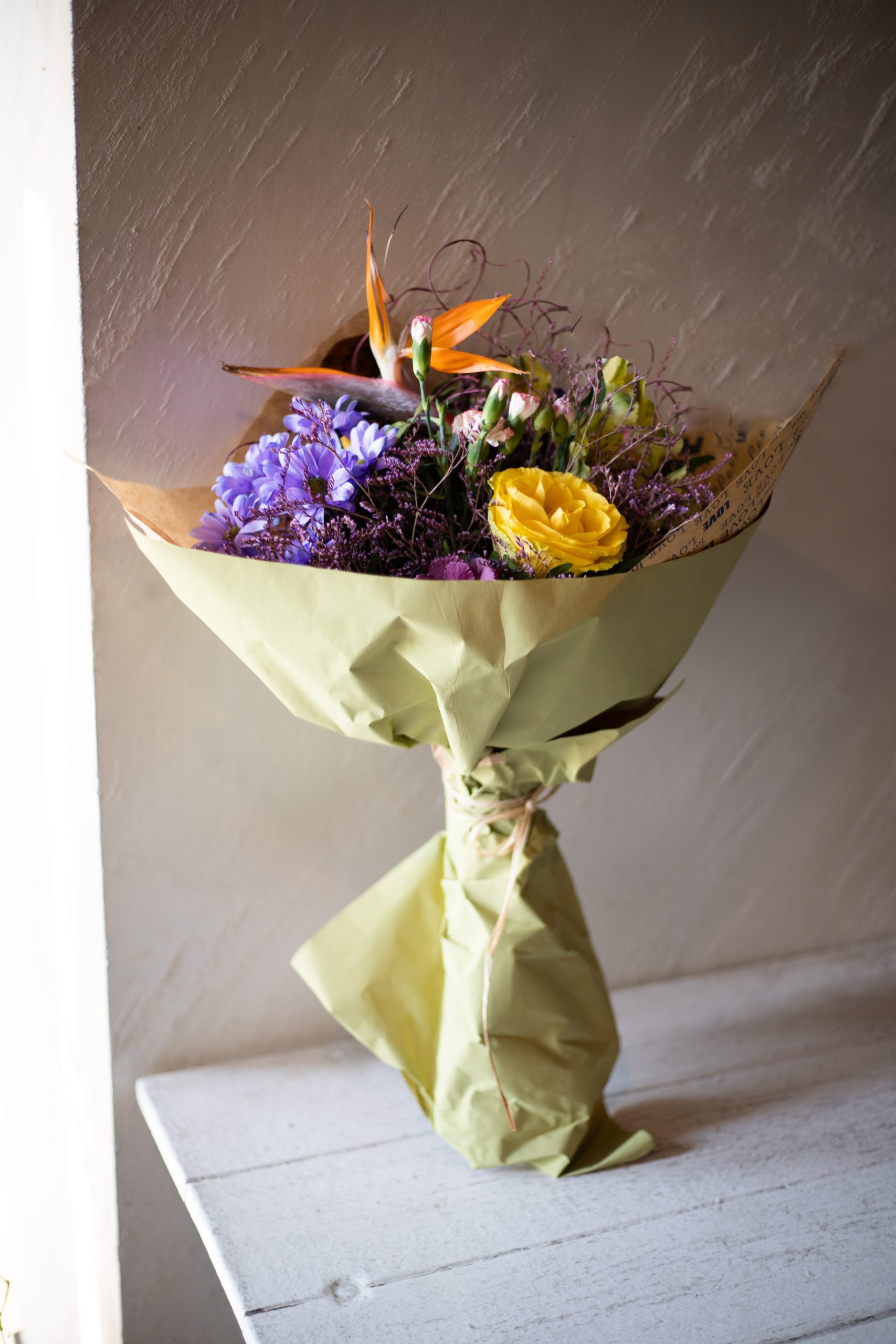 Buket živih boja u žuto-ljubičastim nijansama.
