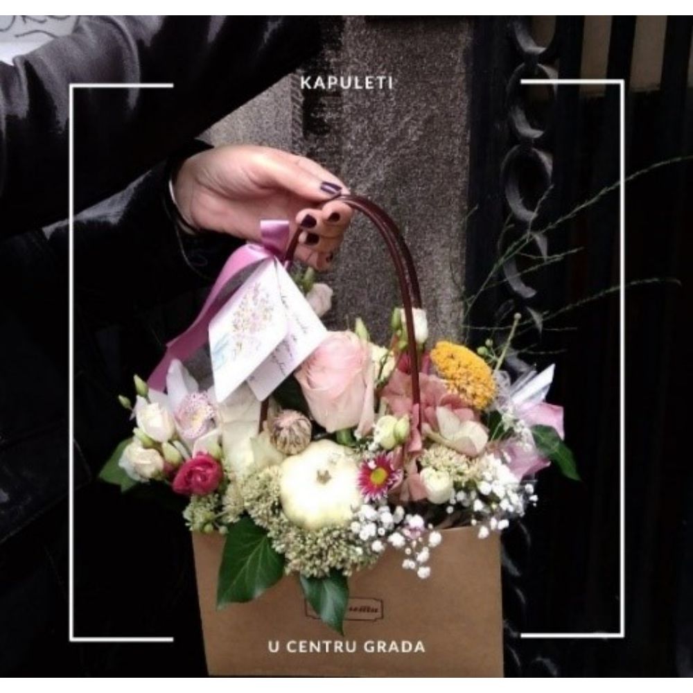 Cvetna torbica , neodoljiva kombinacija sezonskog cveća i dostupnog zelenila.